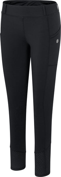 New Eleve Hybrid leggings that offer a softer waist with belt loops and faux back pockets, finished with a silicone knee patch for added grip and convenient cell phone pocket on both hips. These leggings are a ride-day essential but can also be comfortable wearing around town.